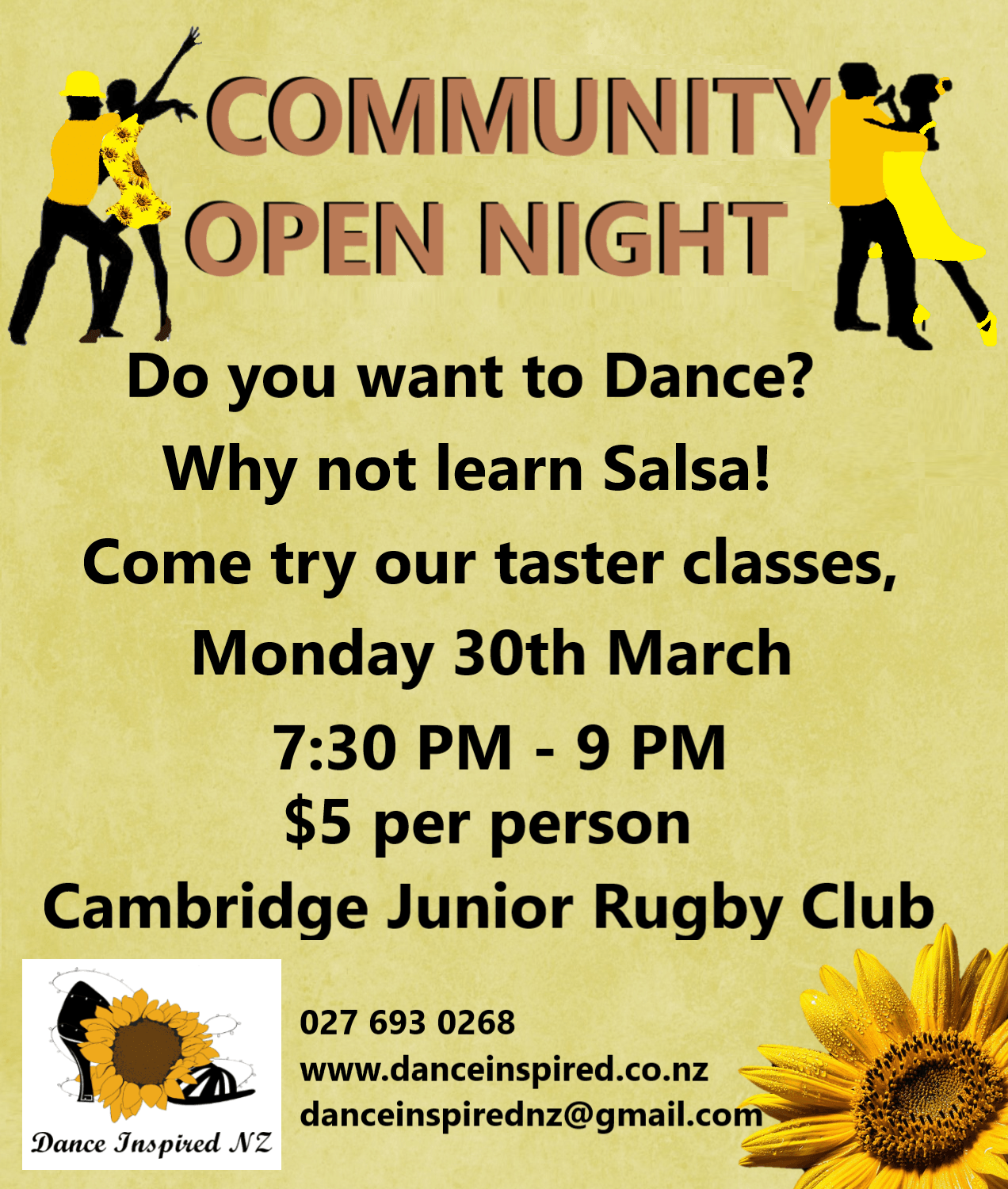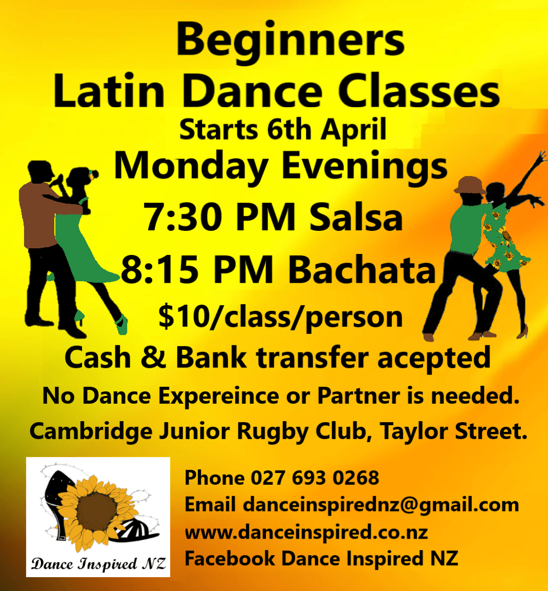 Come along to the Cambridge Junior Rugby Club, Monday 30th March and check out our simple taster classes, in Salsa and Bachata.